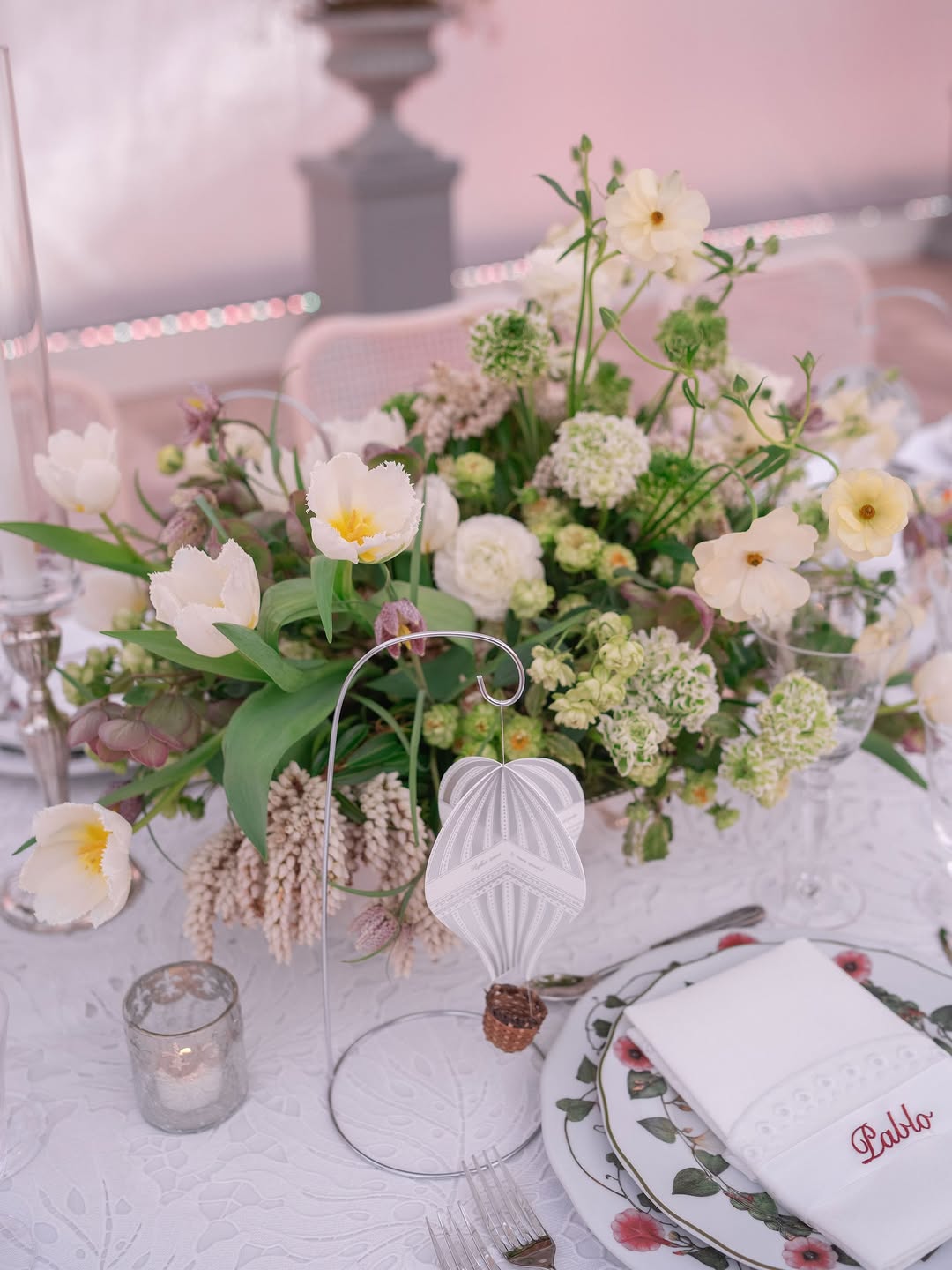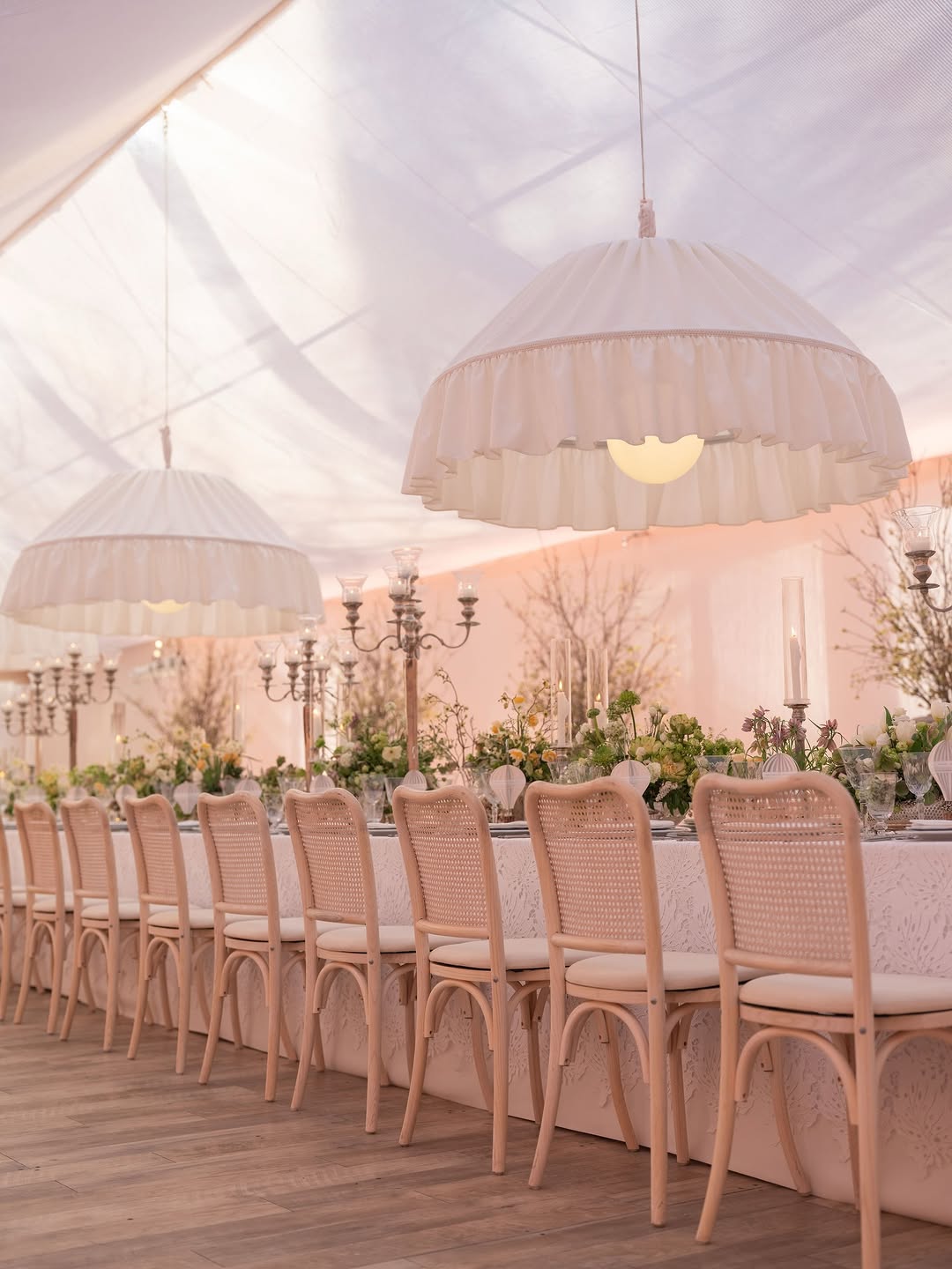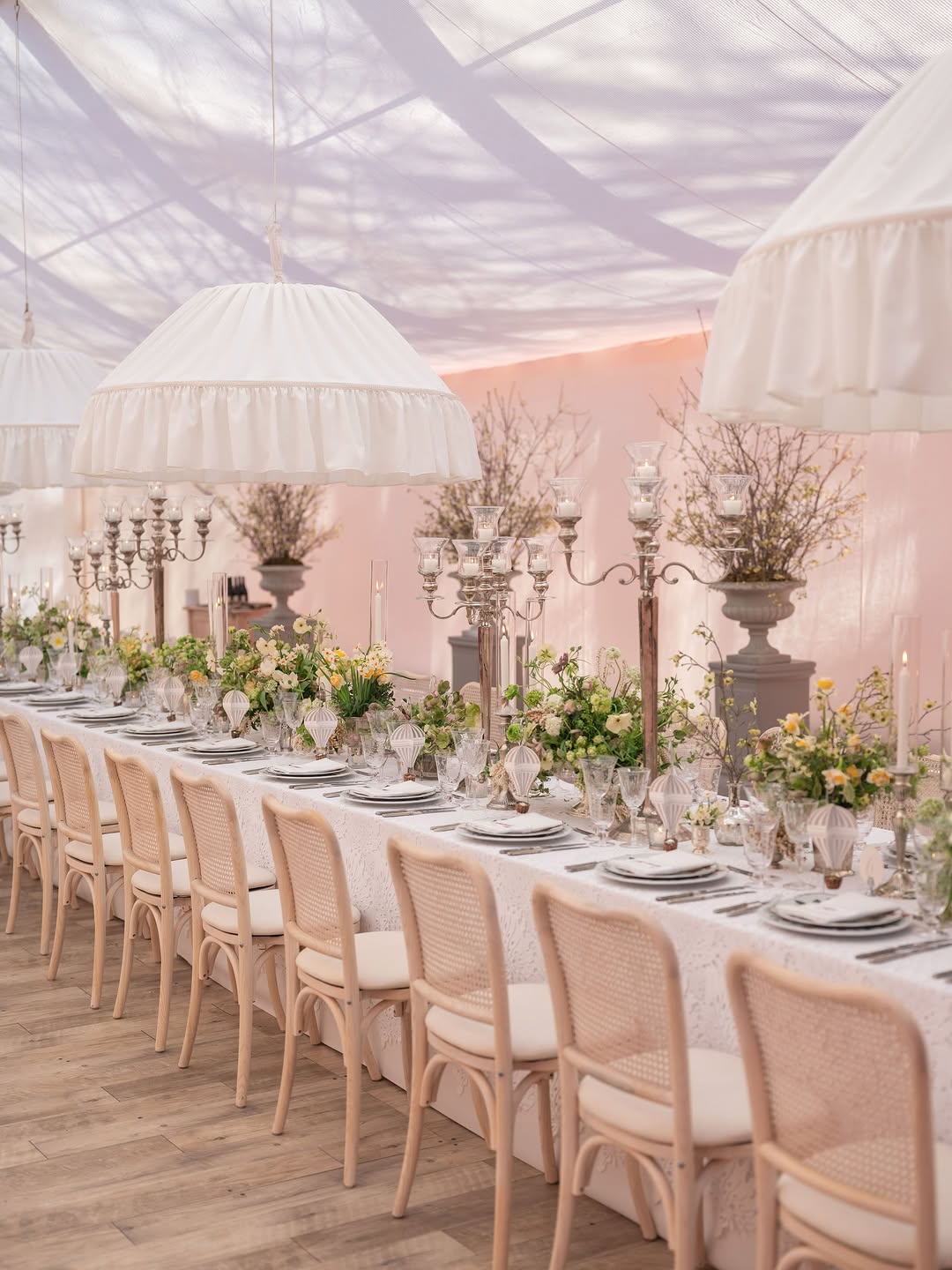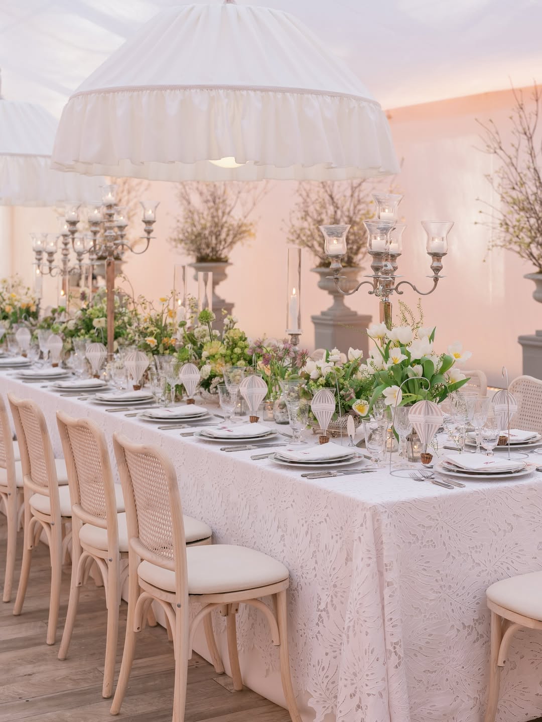 When all the most beautiful details come together for a special spring gathering — lace, vintage silver, fresh blooms, oversized dreamy smocked lights, floating menus, delicate embroidered ribbons, and an unforgettable guest list.
