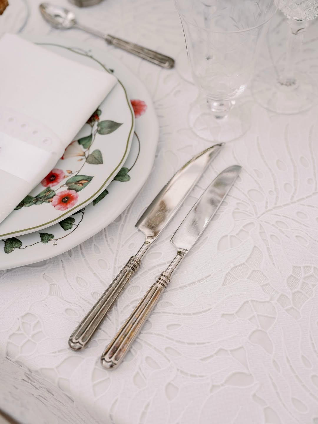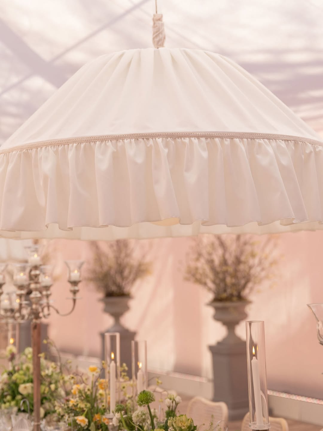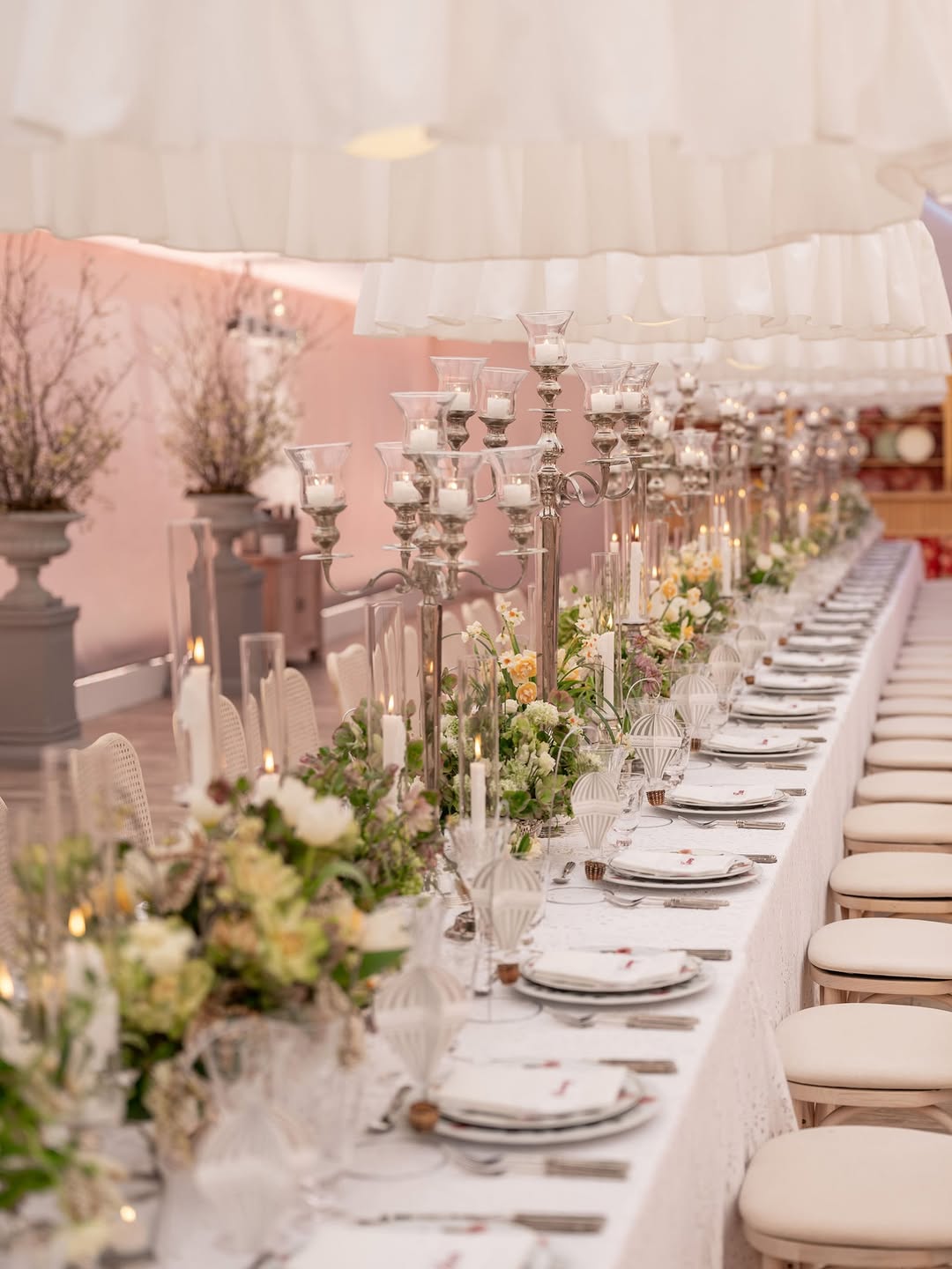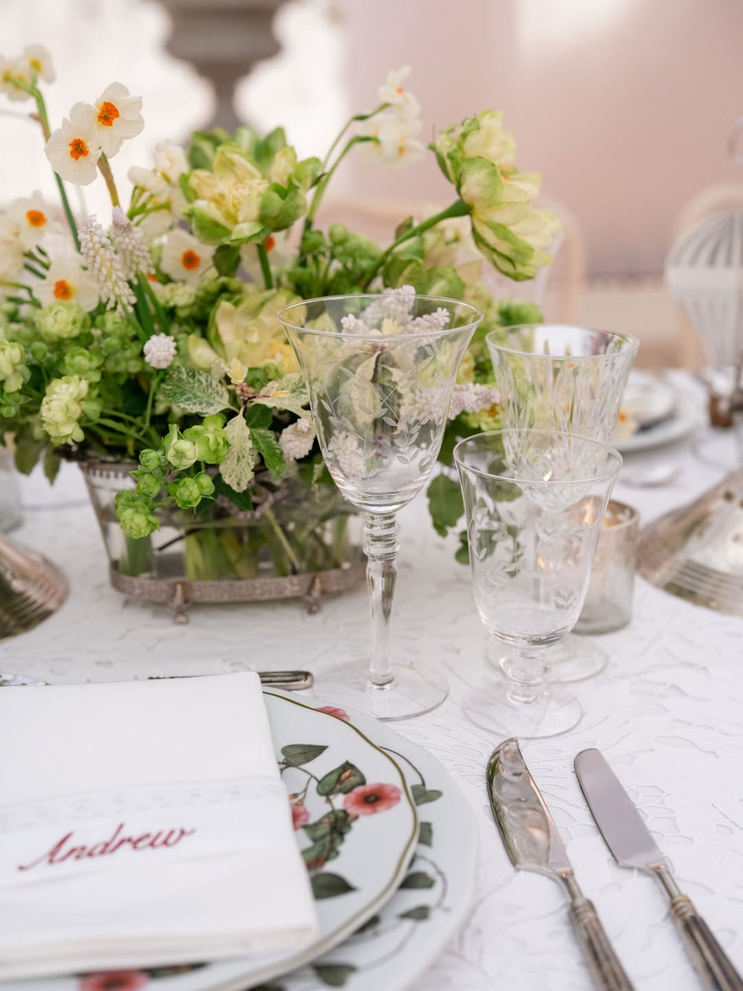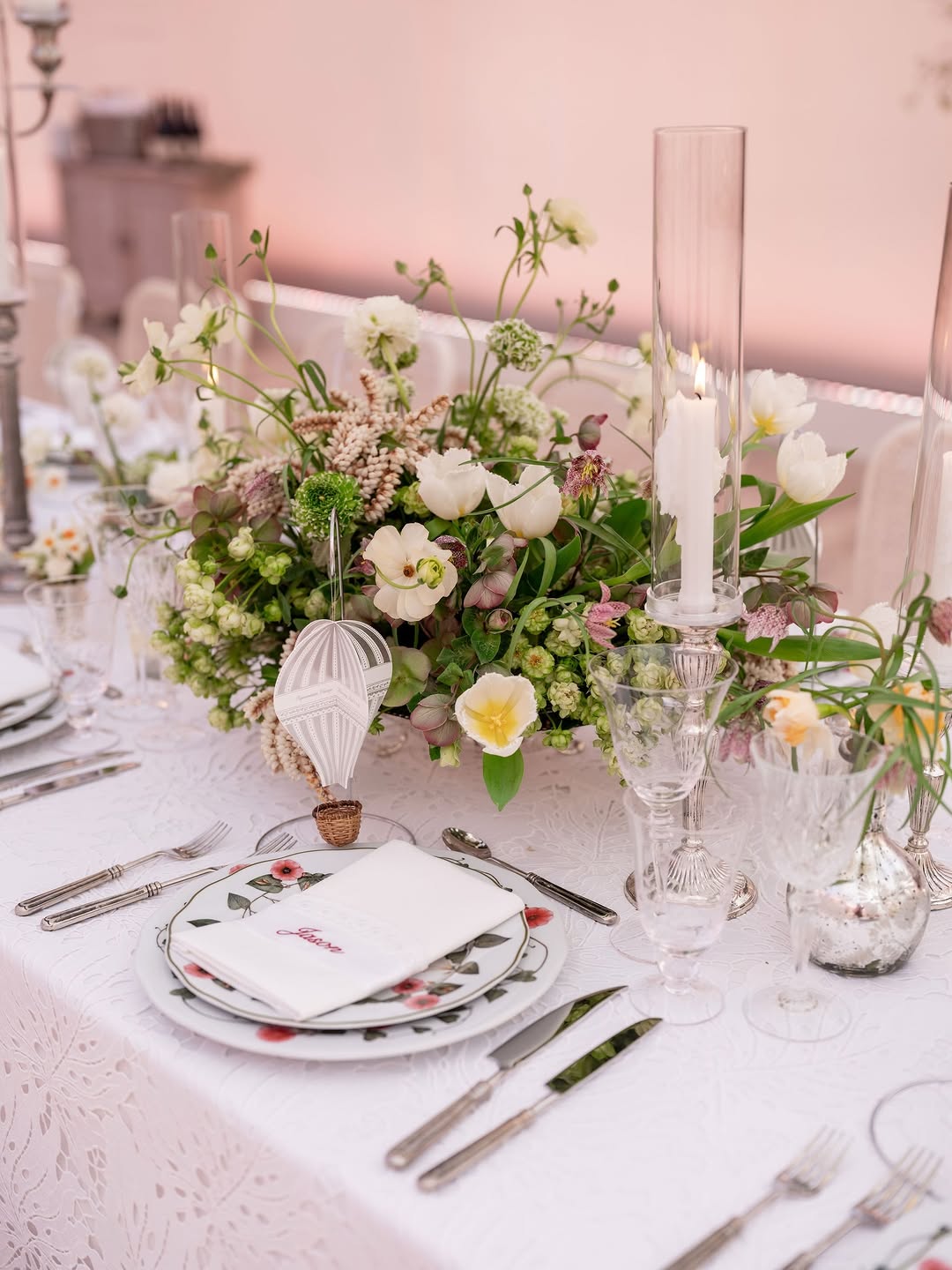 When all the most beautiful details come together for a special spring gathering — lace, vintage silver, fresh blooms, oversized dreamy smocked lights, floating menus, delicate embroidered ribbons, and an unforgettable guest list.