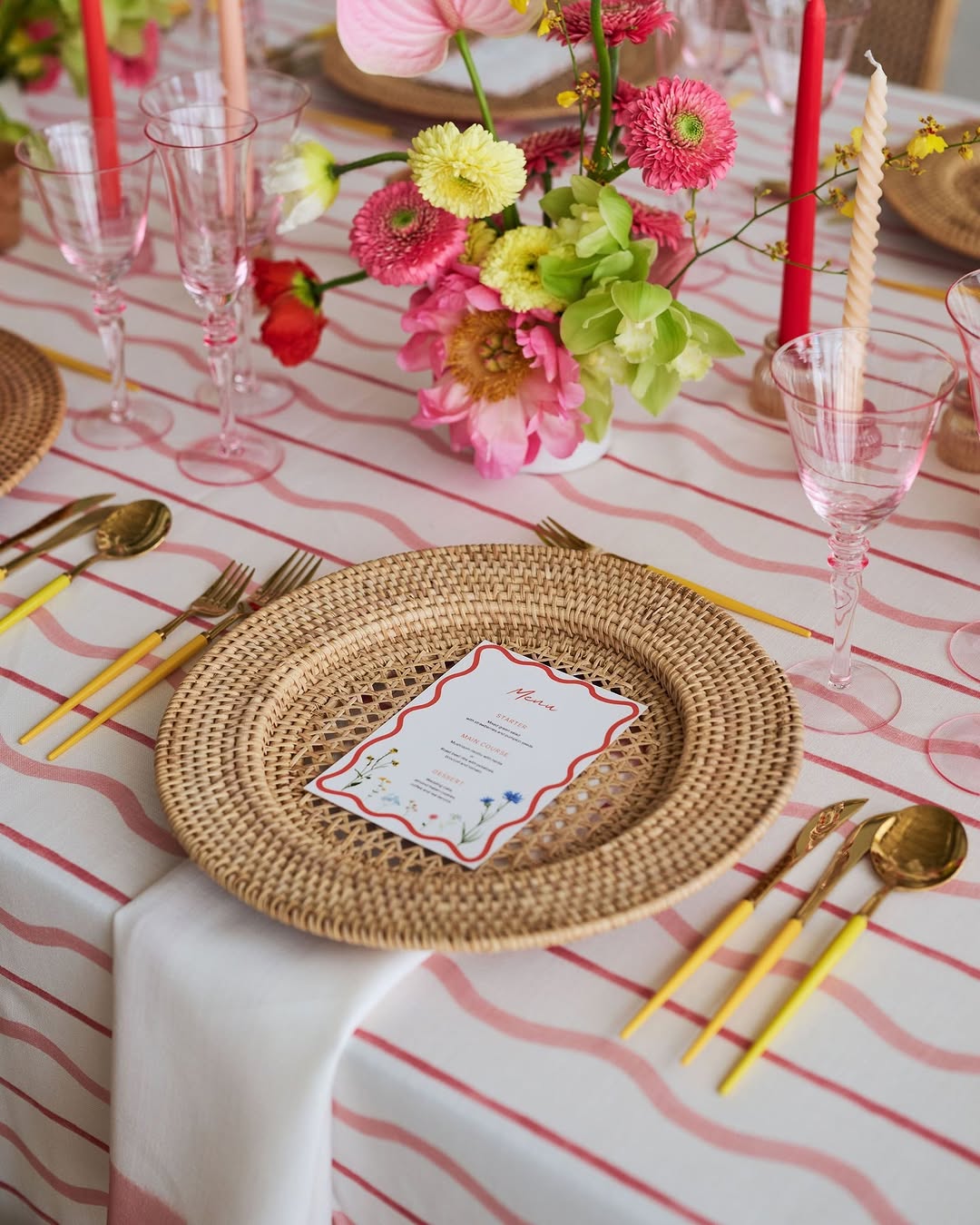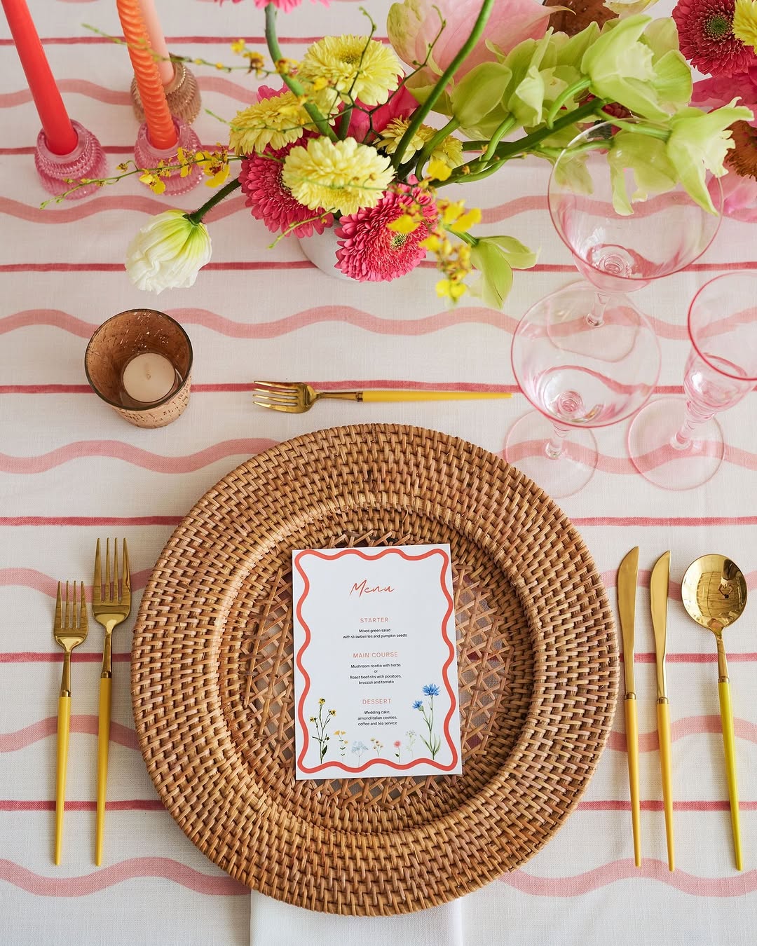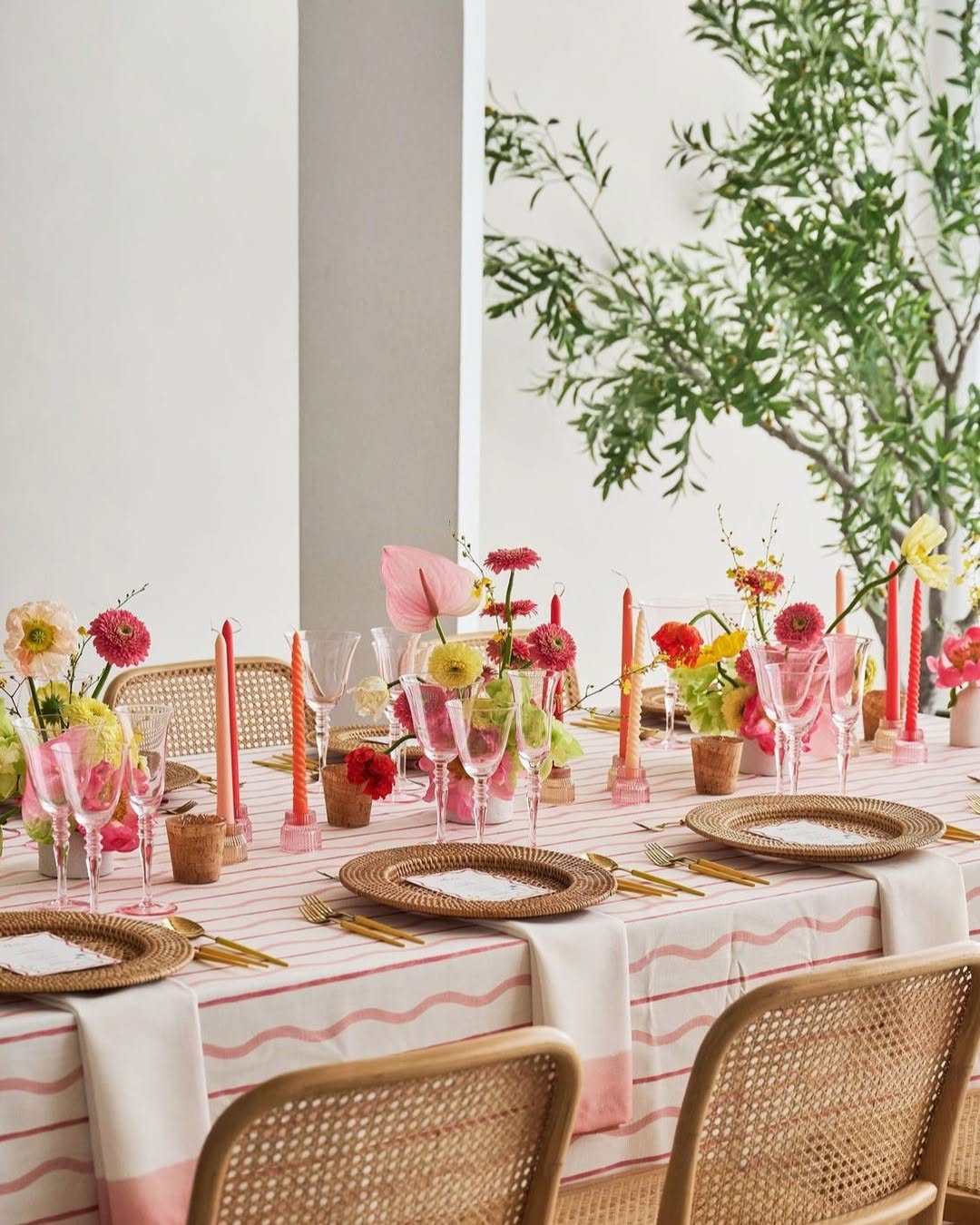 Color and joyful palettes are whispering to us 🌸 The wavy stripe of our Soft Coral Isla linen, punchy pinks, and citrusy pops, all melt together for a lively and feminine Valentine's season!