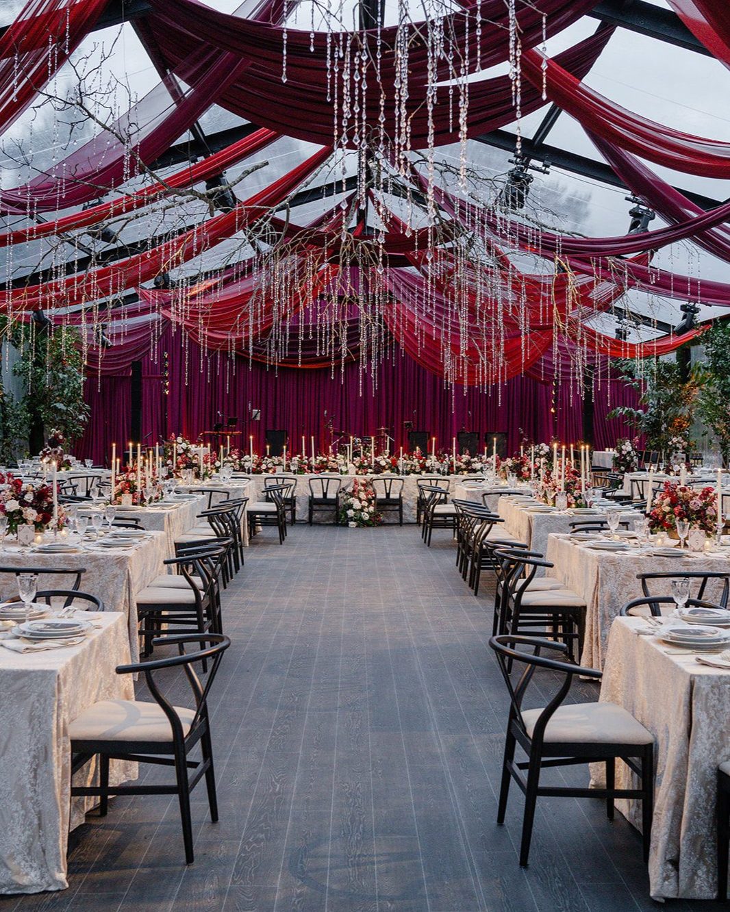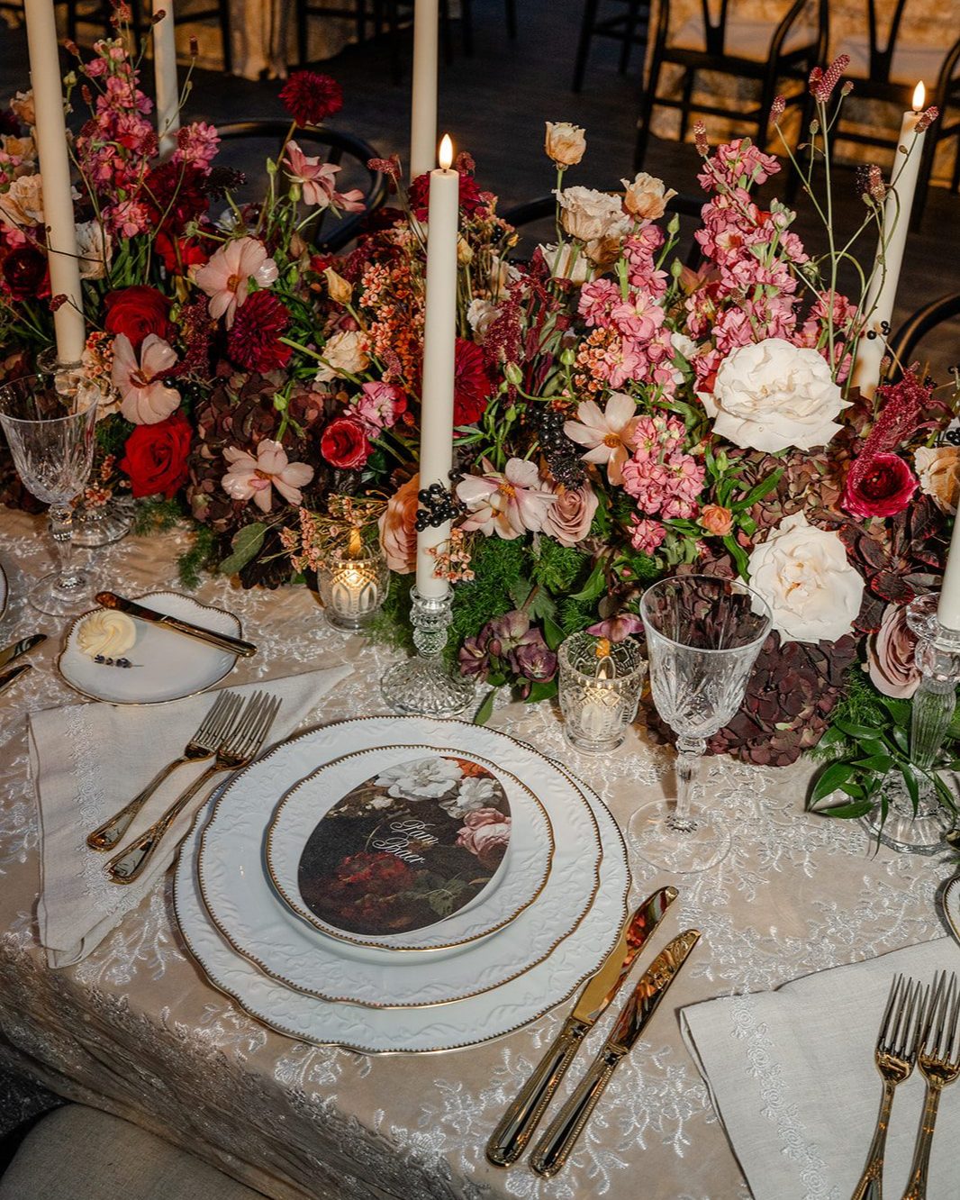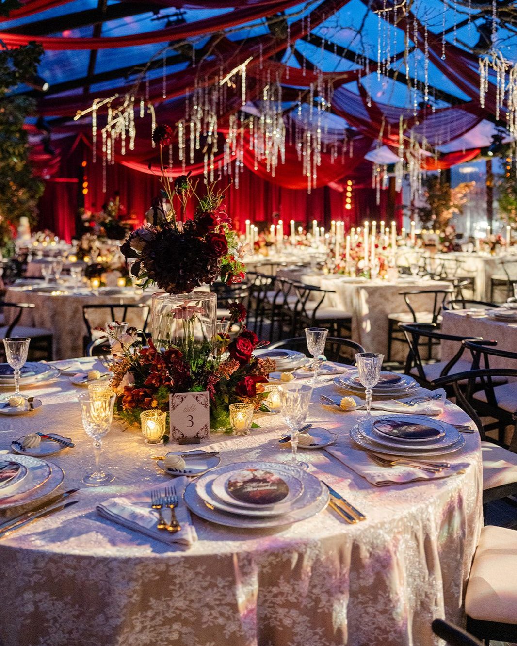 Ruby draping, glittering crystal details, candlelit blooms, and our delicate Oat Eden embroidered linen made for a glowing, magical moment.