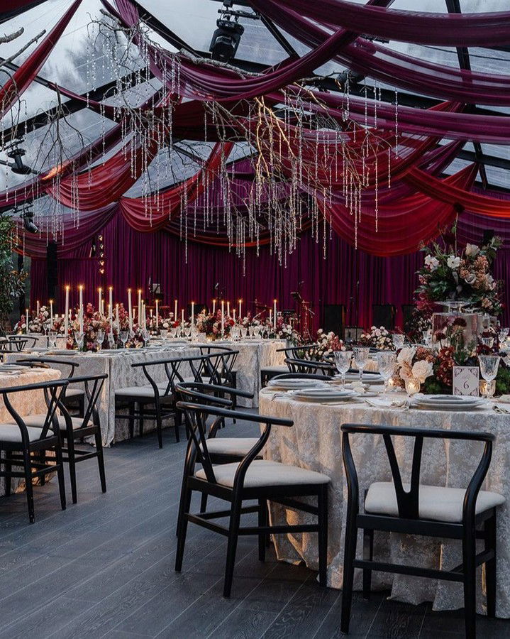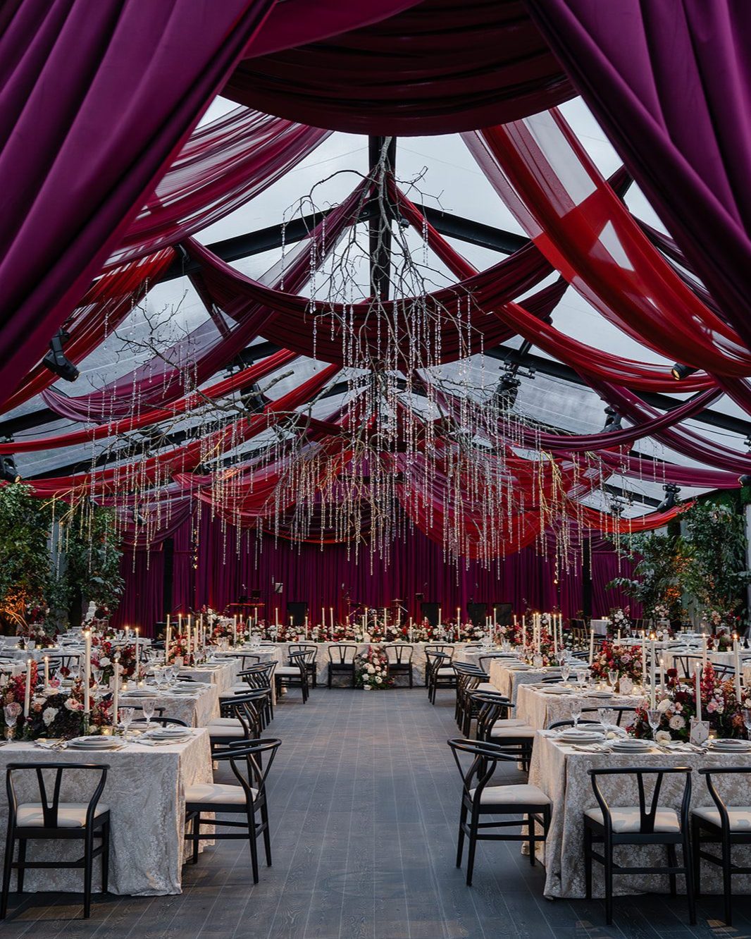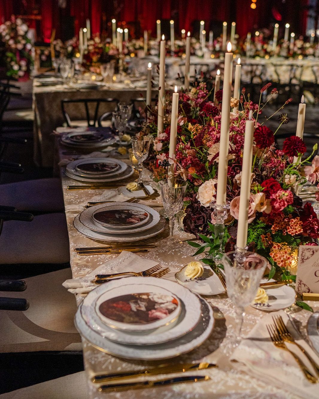 Ruby draping, glittering crystal details, candlelit blooms, and our delicate Oat Eden embroidered linen made for a glowing, magical moment.