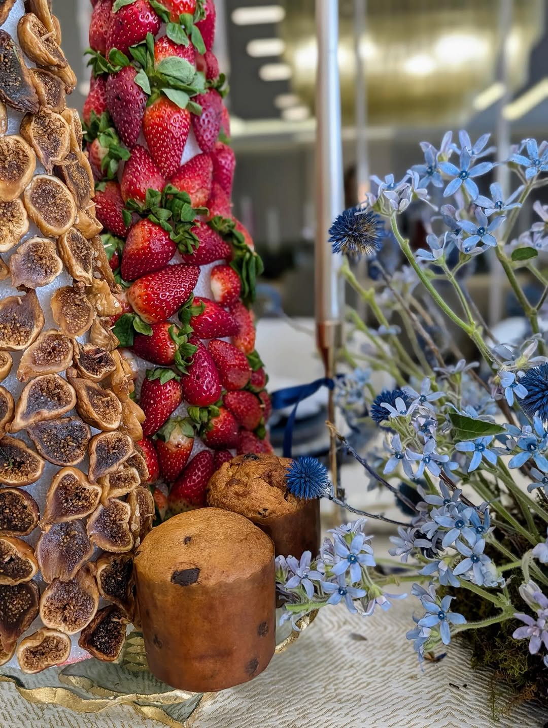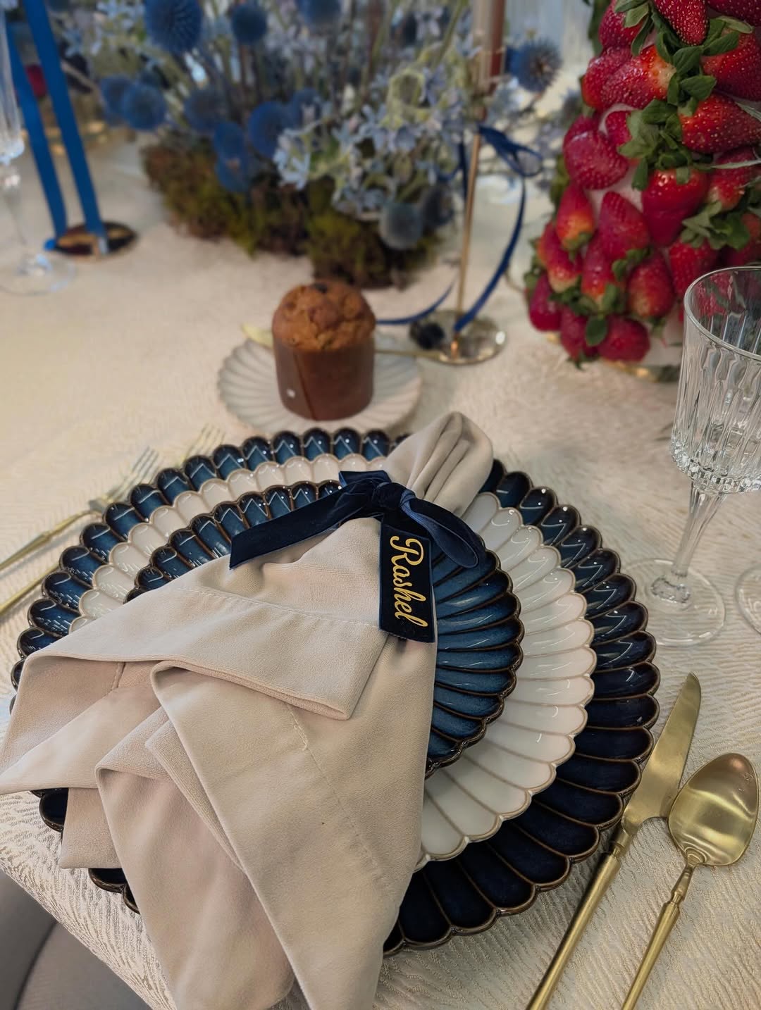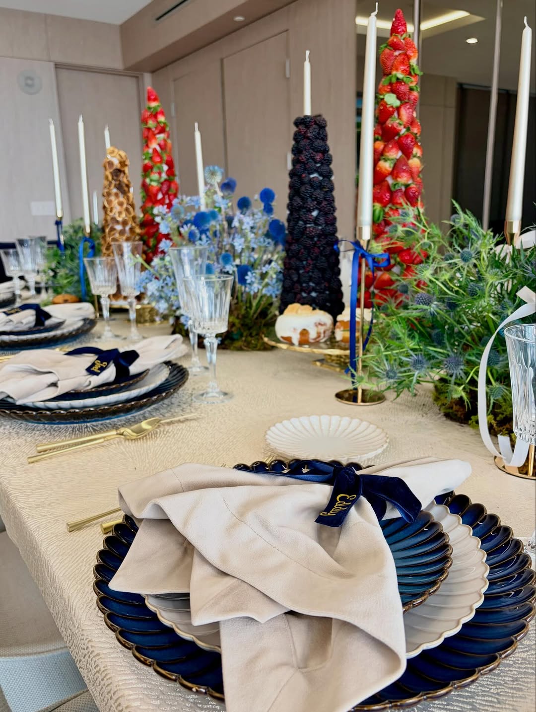 The true showstoppers were the tall fruit cones, bringing height, drama, and a festive holiday feel in a way that felt fresh and far from traditional Hanukkah décor. And to tie it all together, we added custom bows with each guest’s name, doubling as both décor and place cards, because you know how much I love when details are beautiful and functional.
