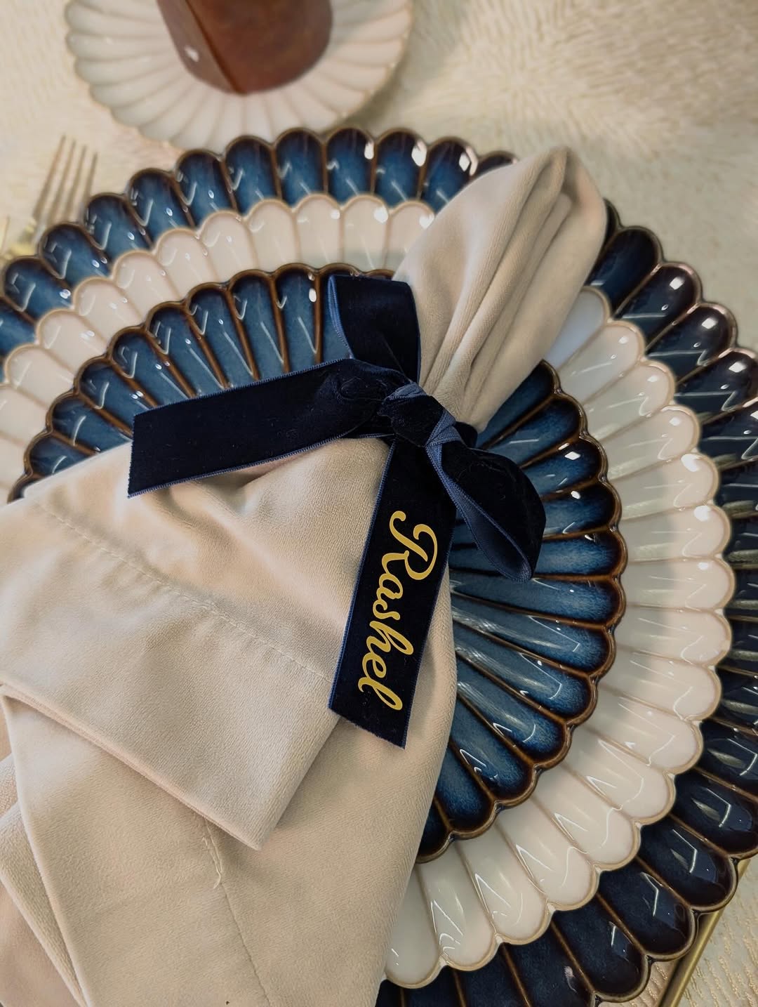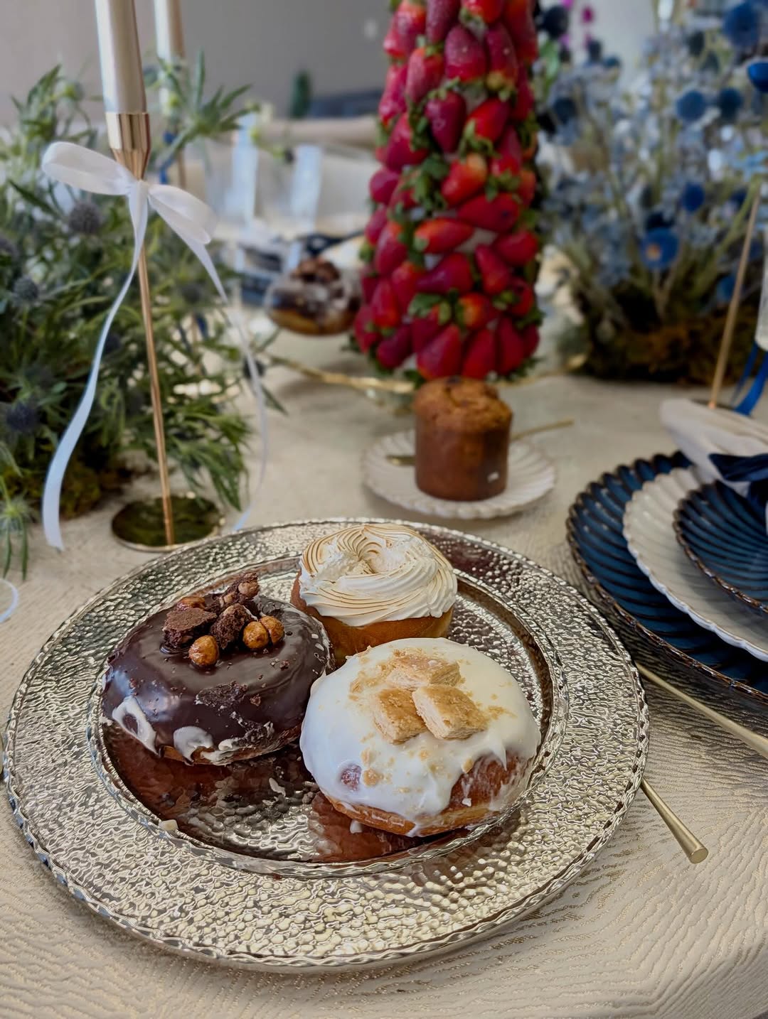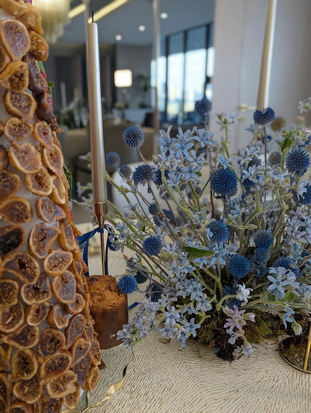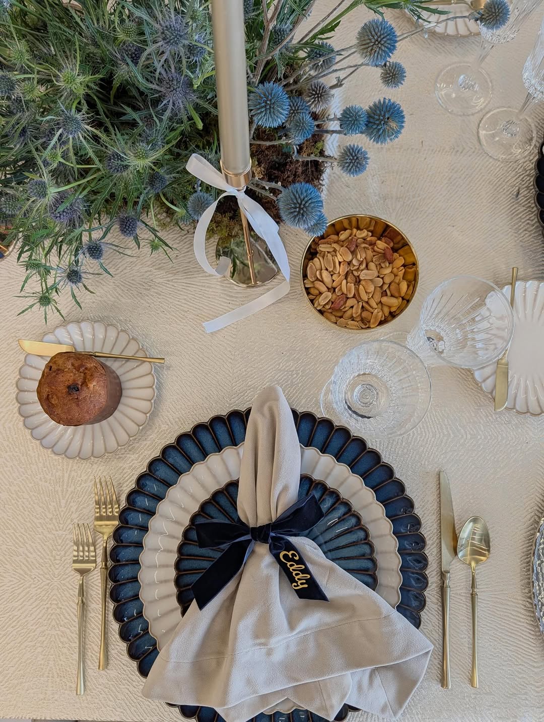 The true showstoppers were the tall fruit cones, bringing height, drama, and a festive holiday feel in a way that felt fresh and far from traditional Hanukkah décor. And to tie it all together, we added custom bows with each guest’s name, doubling as both décor and place cards, because you know how much I love when details are beautiful and functional.